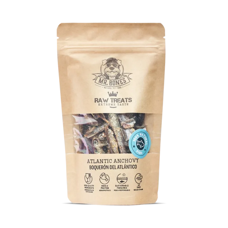 Los Raw Treats de Boquerón son premios naturales para perros y gatos, elaborados exclusivamente con boquerón del Atlántico secado a baja temperatura.