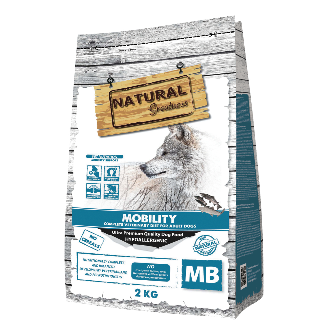 Natural Greatness Veterinary Diet – Mobility es un alimento completo y dietético especialmente formulado para apoyar el metabolismo de las articulaciones en caso de osteoartritis o problemas de movilidad en perros.