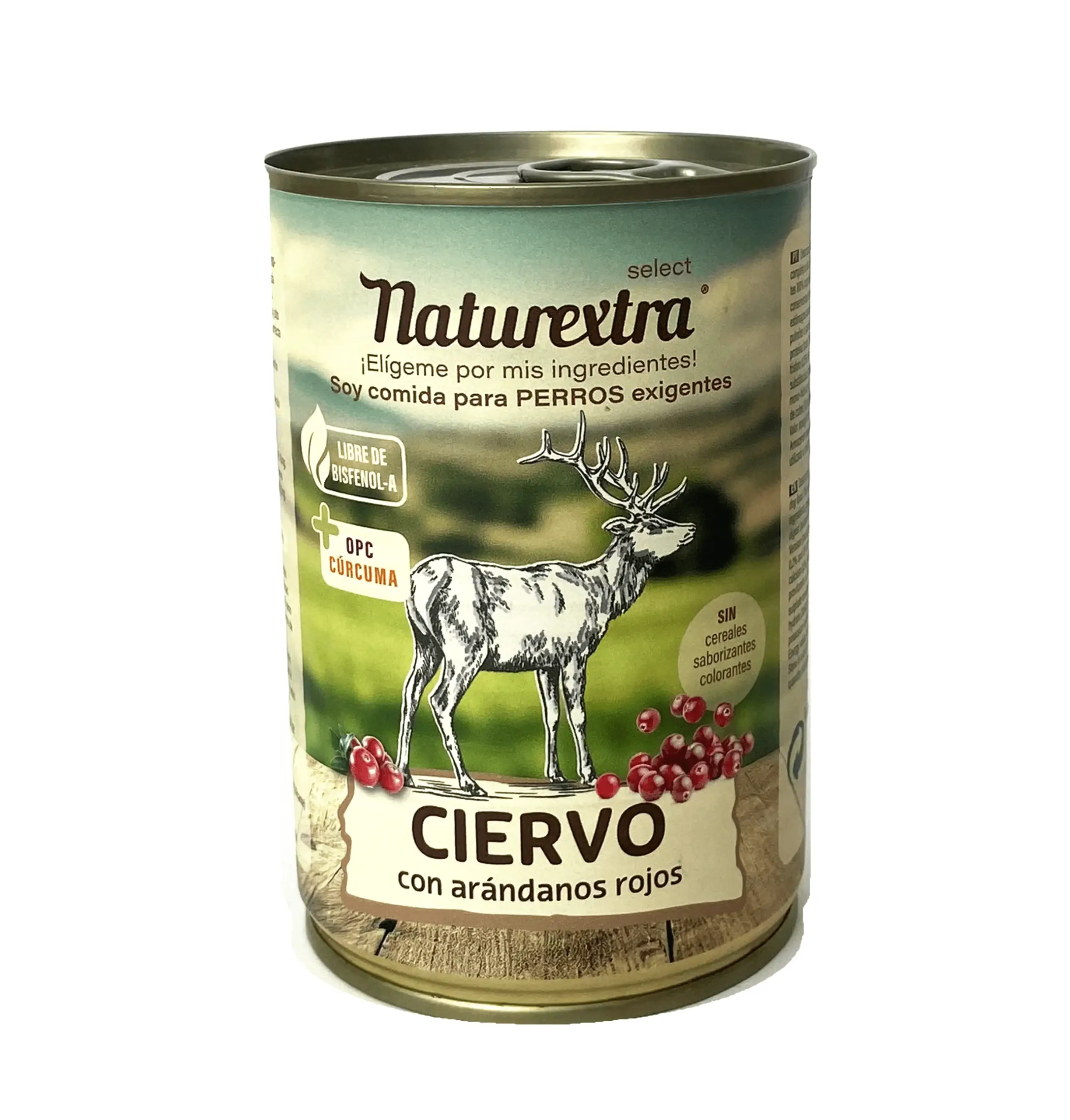 Naturextra Ciervo con Arándanos Rojos es un alimento húmedo completo, natural y equilibrado para perros de todas las edades y razas.